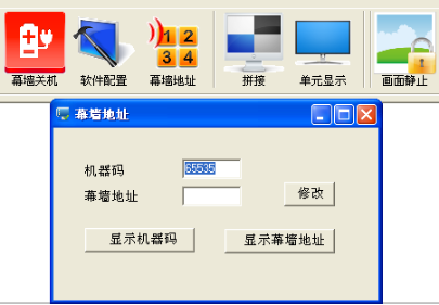 例如以2X2拼接幕為列從左到右數(shù)如圖11中的機(jī)器碼15569顯示的是第四塊屏幕,那么就把15569填寫到機(jī)器碼框中.幕墻地址框中就改成4,點擊修改,然后關(guān)掉完成再進(jìn)行下一個修改.